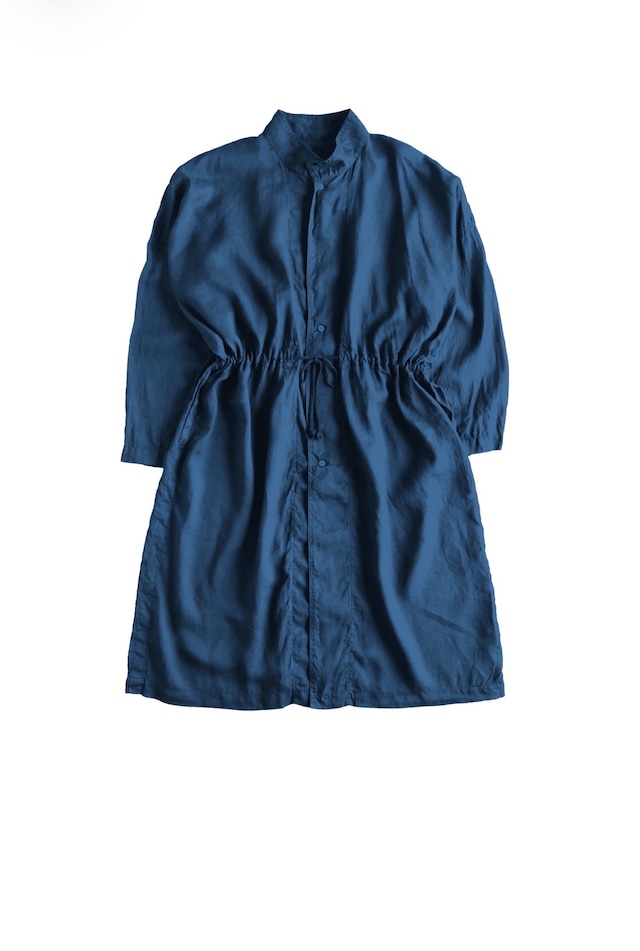 経糸にはラミー100%の糸を使用し、緯糸にはラミーとシルクを混紡した糸を使用して、非常に軽量で薄手の生地に仕上げています。ラミーのさらりとした素材感とシルクの光沢が組み合わさり、シンプルながらも印象的な表情を持つ生地です。経糸・緯糸ともに160番手という非常に細い糸を使用していますが、通常この細さの糸は紡績が難しく、水溶性の糸で補強を加えながら織り上げています。織り上げた後に湯洗いを行い、その際に補強部分を取り除くことで、軽さと薄さを両立した生地となっています。 身幅を大きくとったスタンドカラーのロングコートです。衿を高めに、着丈も長めに設計しており、春から夏、秋頃にかけての強い日差しを遮ることや、朝晩の気温差に対応できるよう想定しています。非常に薄く軽い仕様のため、長時間の着用でも身体への負担が少ないのが特徴です。ウエストにはドローストリングコードを配し、着方やシルエットの調整が可能です。サイドには貫通ポケットを設け、着用したまま内側のパンツやジャケットのポケットに直接手を入れられる構造になっています。 取り扱い方法 ※風合いのある天然素材を使用しています。強く引っ張ったり過度に負荷をかけたりしますと、生地の損傷の原因となりますので、十分にお気を付けください。 ※草木染のムラ感や経年変化をお楽しみください。色移りを防ぐ為に淡色ものとの使用を控え、中性洗剤で洗い陰干ししてください。汗や光により変退色しますので、太陽光や蛍光灯などを避けて保管するなど取扱いにご注意ください。(胡桃) ※天然藍で染色しています。使用を繰り返すことで淡い色へと変化していきます。色移りの可能性があるので、初めは淡色のものとの使用は控え、中性洗剤で洗濯してから陰干してください。1点1点、色の出方やサイズが微妙に異なります。(藍(淡)・藍・藍×胡桃) お直しにつきましてはhttp://mittan.asia/repair/ をご覧ください。