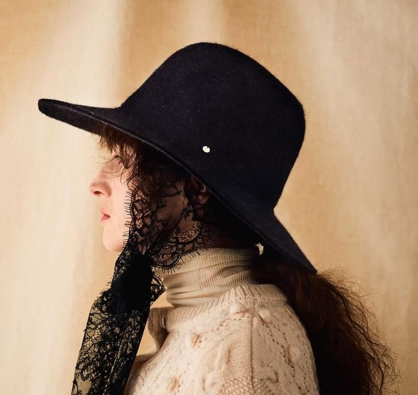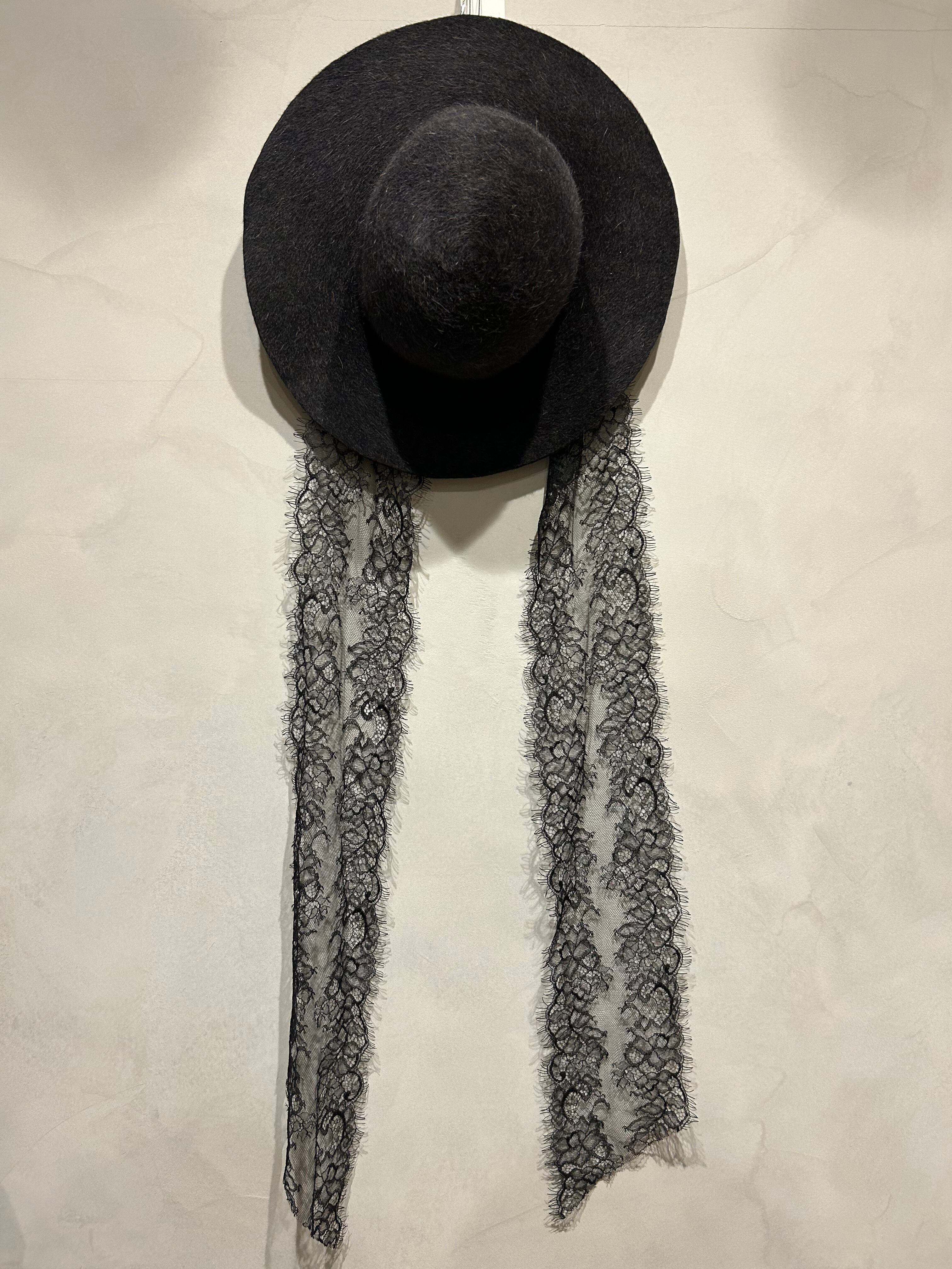 幅広のリバーレースのリボンが印象的なキャペリンハット。