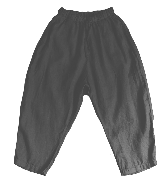 自重と携行物の重さに耐えられるようにベルトループを付けていますが、ウエストゴムと紐でベルトを用いなくても着用が可能です。パターンはもんぺやたっつけを参考にしています。股上は深いものの、運動量を確保しているので動きやすいのが特徴で、膝から裾にかけて入っている急なテーパードは、ロールアップによって調整が可能です。機能性を備えながらもシンプルなデザインの為、体型を問わず好みのサイズ感を選んでいただけます。腰紐には京都・宇治で製紐したオリジナルの紐を、縫製にはロックミシンに至るまですべて綿糸を使用しています。