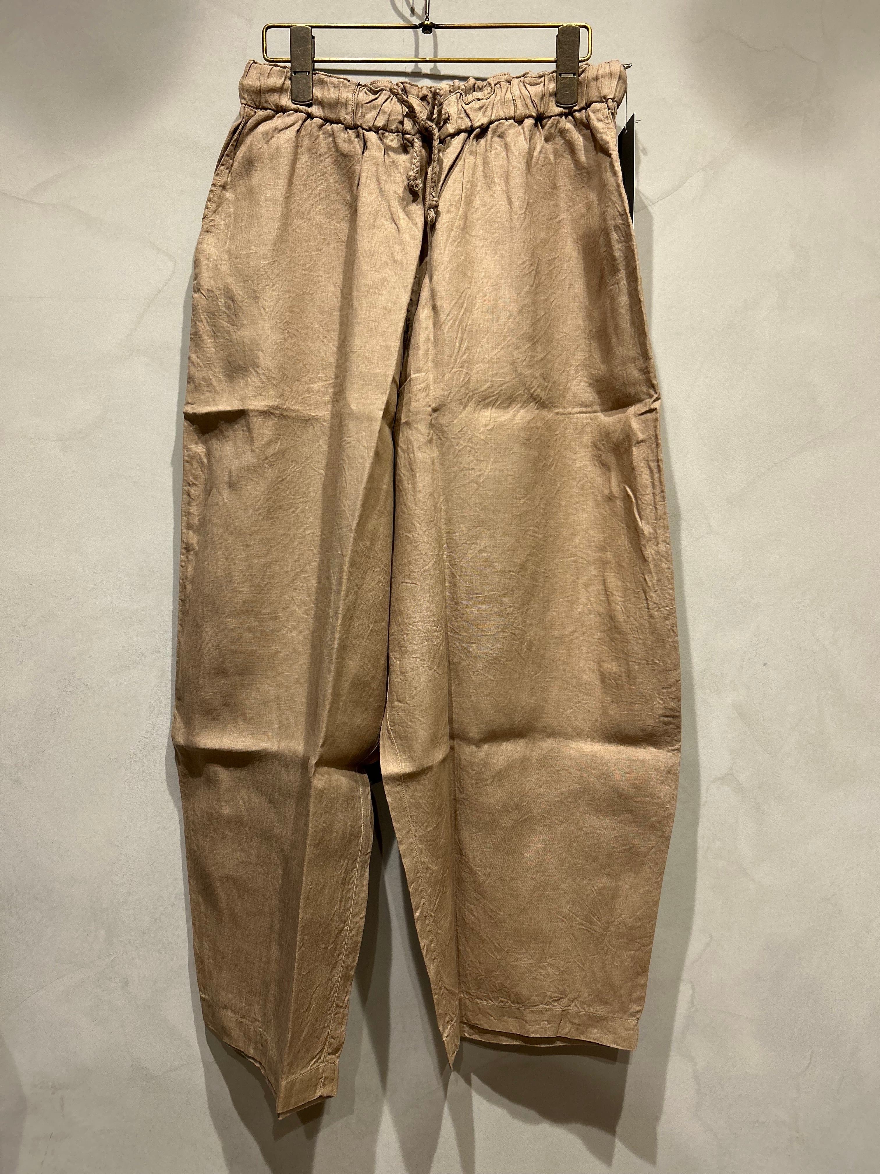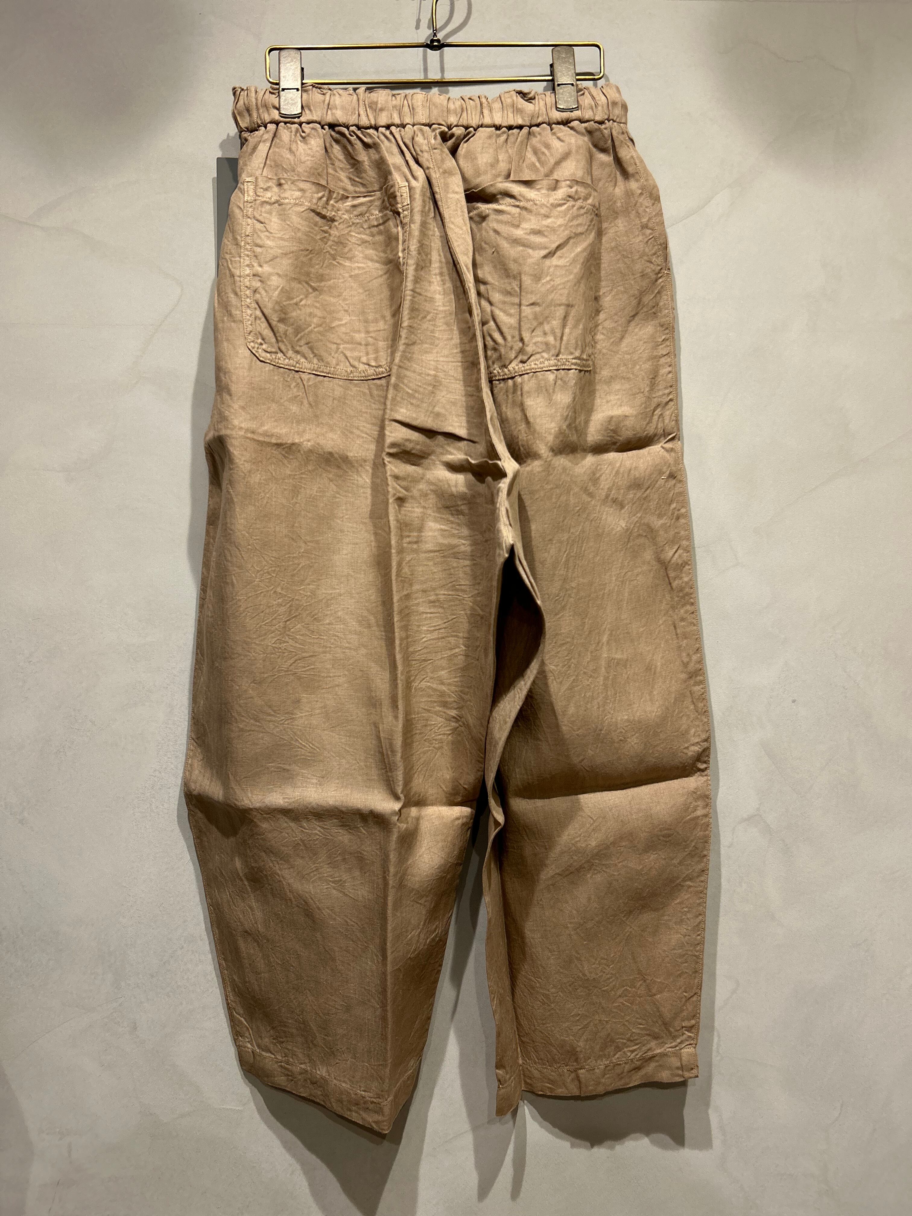 自重と携行物の重さに耐えられるようにベルトループを付けていますが、ウエストゴムと紐でベルトを用いなくても着用が可能です。パターンはもんぺやたっつけを参考にしています。股上は深いものの、運動量を確保しているので動きやすいのが特徴で、膝から裾にかけて入っている急なテーパードは、ロールアップによって調整が可能です。機能性を備えながらもシンプルなデザインの為、体型を問わず好みのサイズ感を選んでいただけます。腰紐には京都・宇治で製紐したオリジナルの紐を、縫製にはロックミシンに至るまですべて綿糸を使用しています。