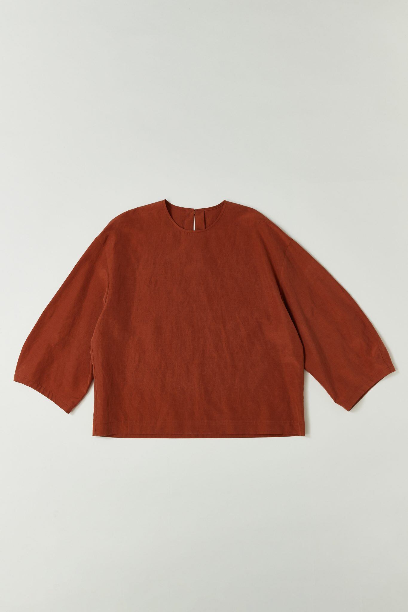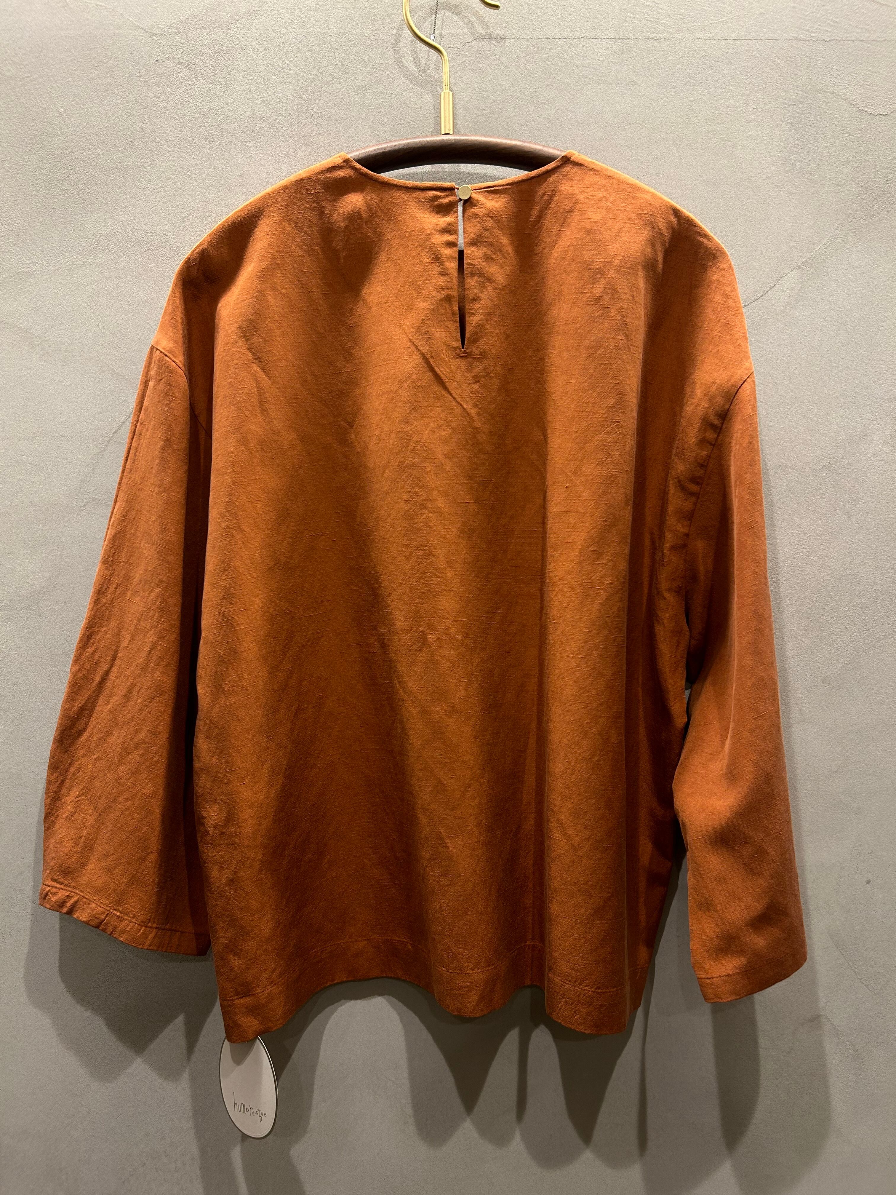 クラシカルな雰囲気をもち、リラックスした着心地のブラウスです。生地の程よいハリ感が肩から幅広の袖や裾にかけてふっくらとやわらかなフォルムを描き、油絵のような厚みのある陰影をつくります。袖は近年のhumoresqueでは珍しく手首が見える丈感です。袖から覗く手元やラウンドネックの首元には清げなる大人の印象があり、ふっくらとリラックスしたフォルムとの対比もお楽しみいただきたいブラウスです。背面ネックポイントに一つだけ添えた金色のボタンが小さなアクセントです。
