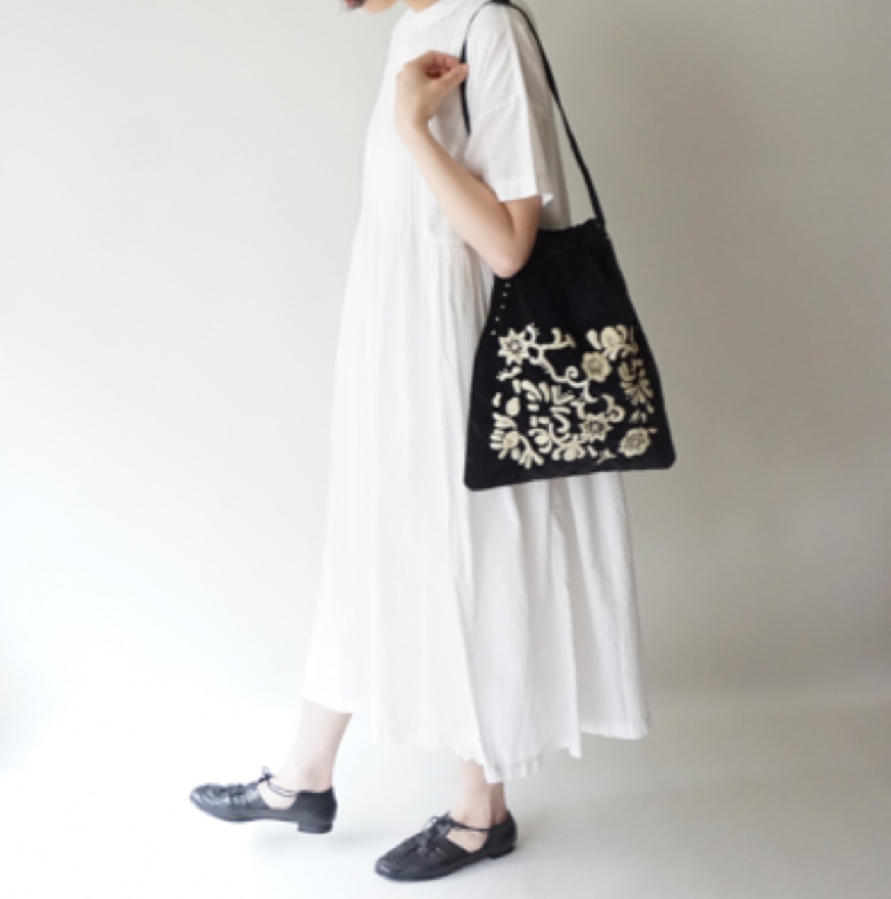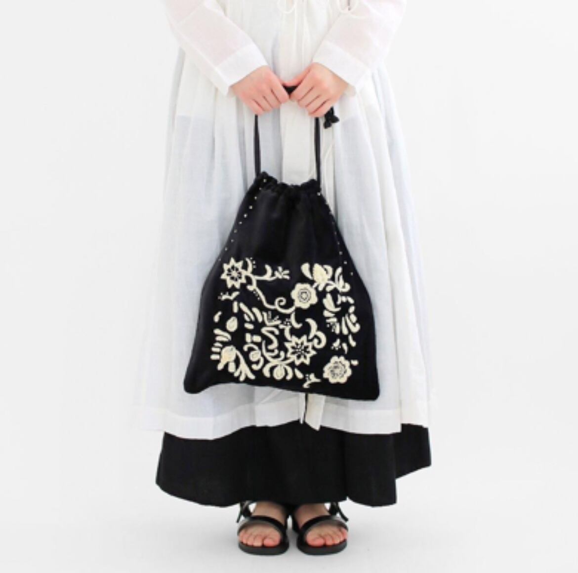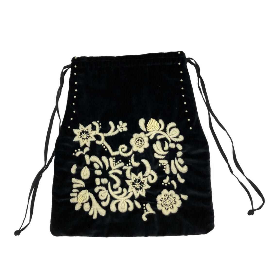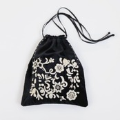 毎シーズン人気のベルベットバッグ。上品な光沢のある素材感に、様々なお花をモチーフにした美しい刺繍が施されています。存在感のある佇まいは、持つだけでワンランク上の装いに。マチ無しの巾着型デザインで、お財布はもちろんノートくらいの大きさであれば余裕で入るサイズ感です。内ポケットがひとつ付いていて実用性も兼ね備えています。長めに設定された紐は、お好みの長さで結んで調整が可能。一番長い状態であればななめ掛けもでき、その時の気分やコーディネートによって色々な持ち方をお楽しみいただけます。