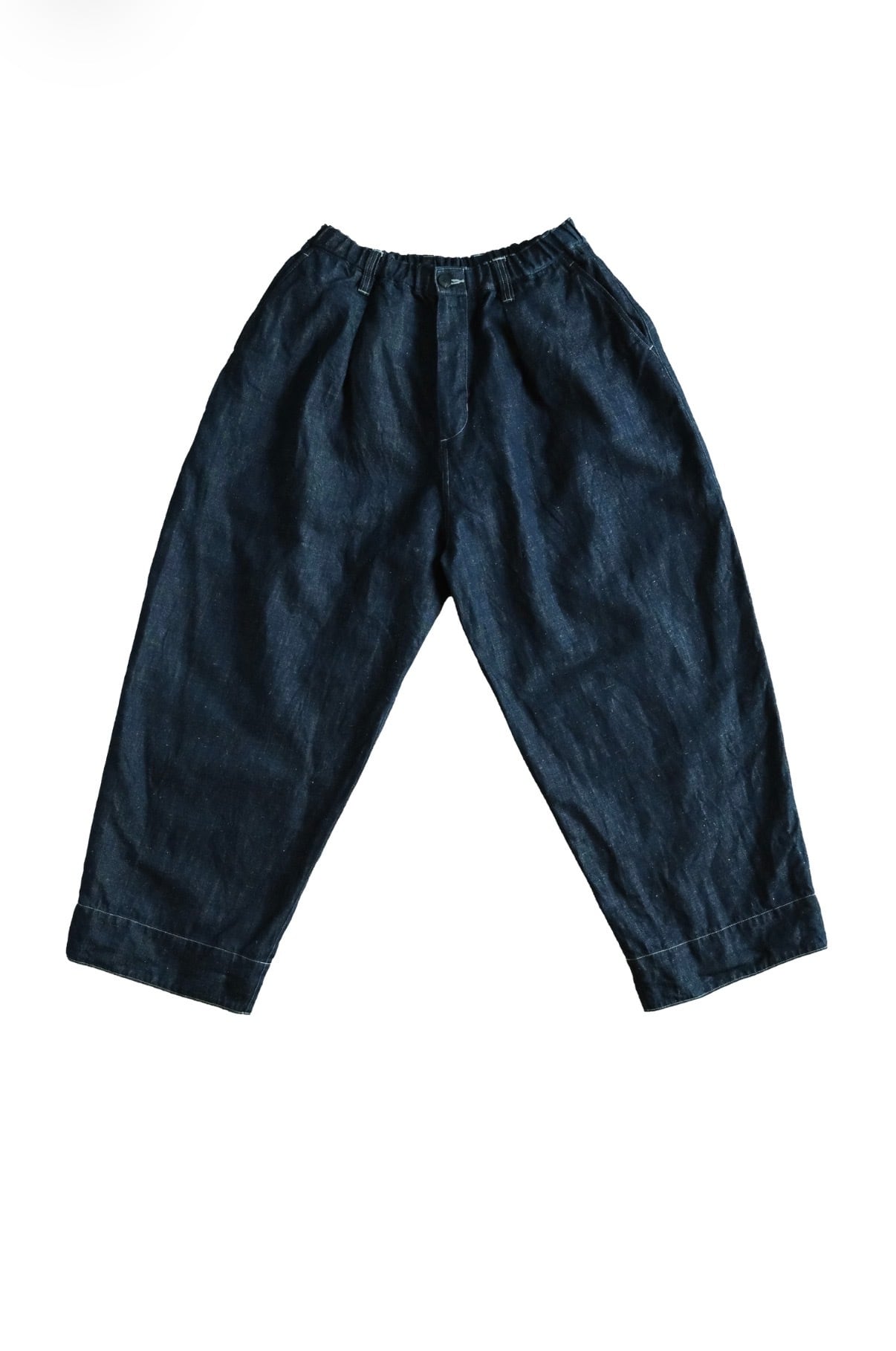 テーパードを入れたワイド型・九分丈のパンツで、新しいシルエットの提案です。ワークウェアの文脈を踏まえながらも、既存のジーンズの形を踏襲せず、MITTAN独自の日常の道具として再定義しました。ウエストベルト全体に伸縮素材を入れ、前開きの仕様を採用しています。本体の脇と内股はシンプルな縫製にすることで、生地への負担を軽減しつつ、修理のしやすさも考慮しています。ボタンには水牛の角を採用しています。